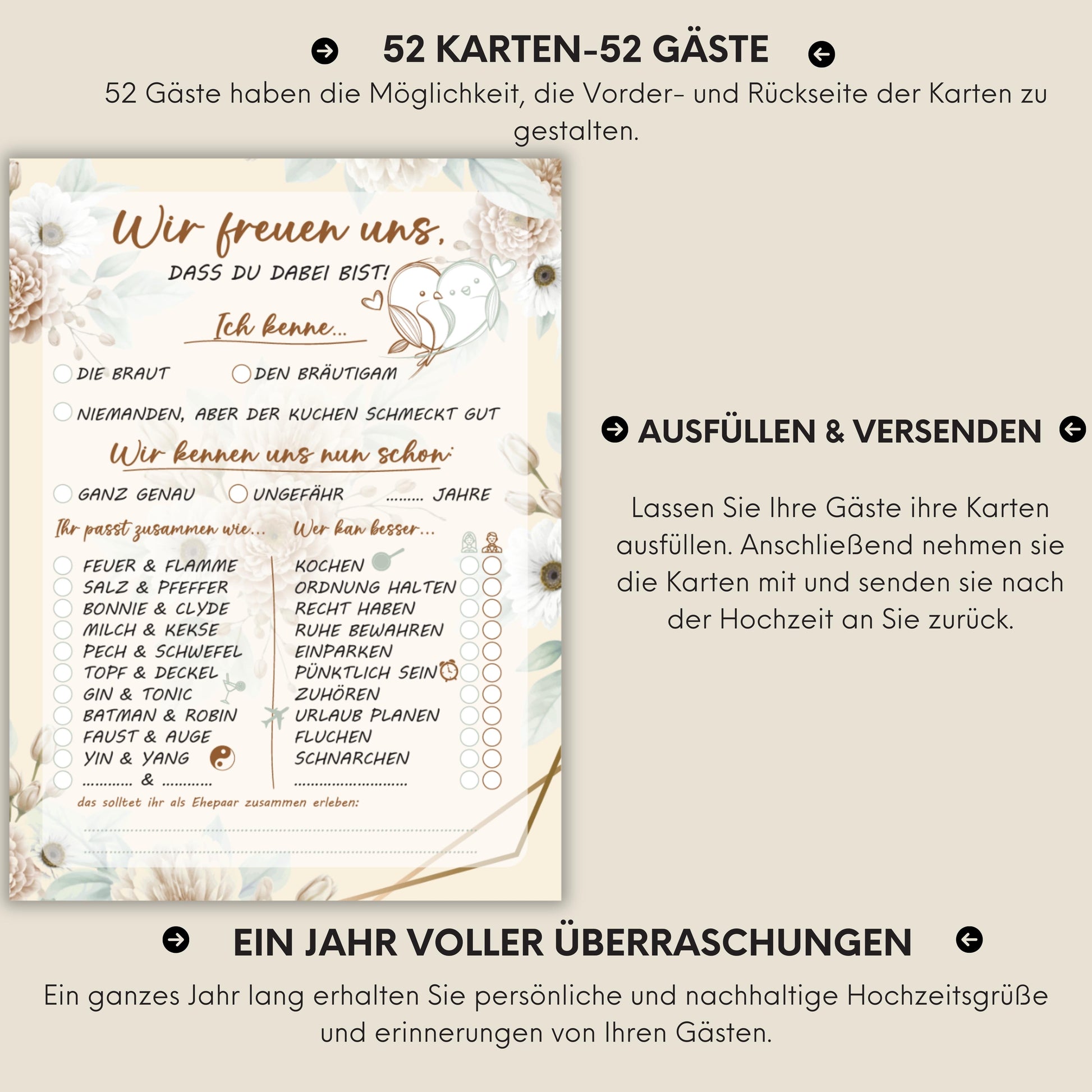 📅 【52 KARTEN FÜR 52 WOCHEN】 Eine tolle Alternative zum traditionellen Gästebuch, bei der die Gäste ihre Wünsche und Grüße auf den Karten festhalten und diese dann im Laufe des Jahres an das Brautpaar senden. Dieses Set bietet eine Karte für jede Woche des Jahres, wodurch das Brautpaar ein ganzes Jahr lang regelmäßig an ihren besonderen Tag erinnert wird.
