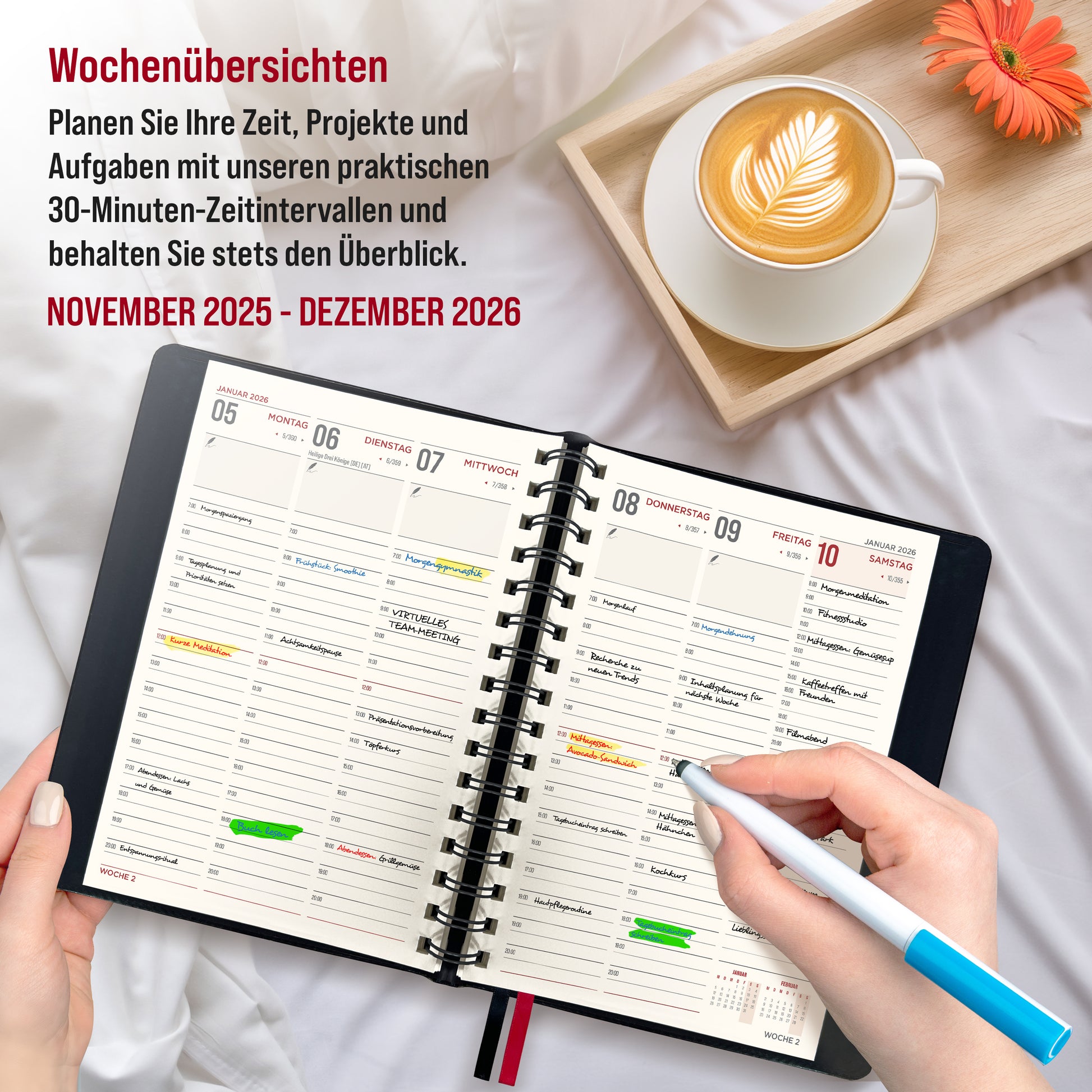 - ★ 【JAHRESZIELE ERREICHEN】Dieser stilvolle Planer für 2025-2026 besticht durch sein minimalistisches Design und sein funktionales Layout mit 30-Minuten-Zeitintervallen (von 07:00 bis 20:00 Uhr). Der robuste weiche Einband, 2 Trennfäden und das elastische Verschlussband machen ihn zum perfekten Alltagsbegleiter. Seine Konstruktion sorgt für eine einfache Handhabung und hilft Ihnen, jederzeit den Überblick über Ihre Ziele und Termine zu behalten. Perfekt für den beruflichen oder privaten Gebrauch.