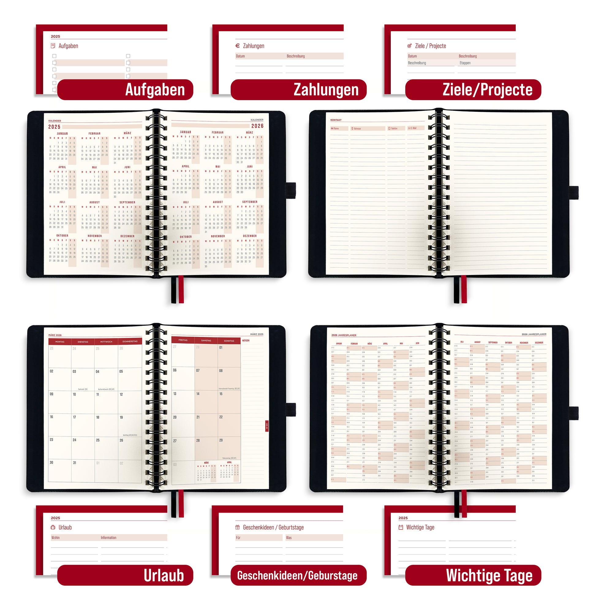 - ★ 【ELEGANZ UND FUNKTIONALITÄT】 Behalten Sie den Überblick über Ihre Termine und verbessern Sie Ihr Zeitmanagement mit diesem stilvollen Planer. Mit einer Jahresübersicht, Monats- und Wochenansichten sowie zusätzlichen Seiten für Kontakte und Notizen bietet er alles, was Sie für eine effektive Planung benötigen. Der Planer ist hochwertig verarbeitet und besteht aus umweltfreundlichem Material (FSC-zertifiziertes Papier). Ideal für Lehrer, Studenten, Berufstätige und Vielbeschäftigte.